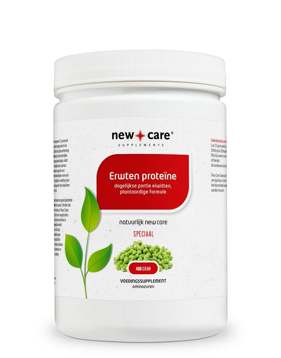 Het lichaam bestaat voor ongeveer 15 procent uit eiwitten. Eiwitten worden aangevoerd via de dagelijkse voeding. Tijdens de spijsvertering worden eiwitten afgebroken tot afzonderlijke aminozuren. Uit deze losse puzzelstukjes stelt het lichaam zelf weer menselijk eiwit samen. Het aantal aminozuren en de volgorde van rangschikking bepalen de uiteindelijke vorm en functie van het eiwit. De dagelijkse voeding kan heel eenvoudig worden aangevuld met eiwitten uit New Care Erwten proteïne 400g.